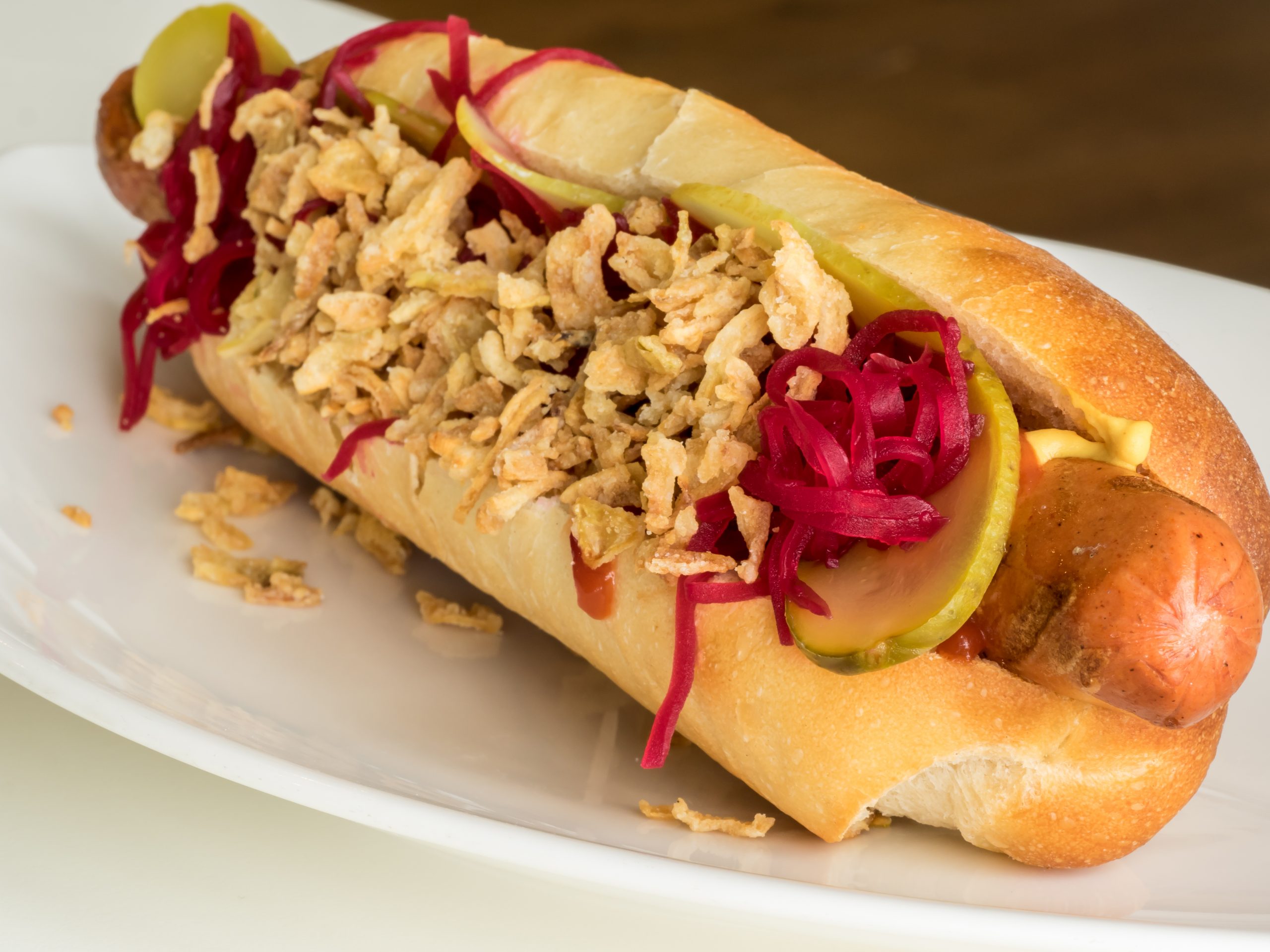 Salchicha artesana Bockwurst, queso fundido, cebolla frita, pepino agrio y remolacha. Servido con mostaza americana y ketchup