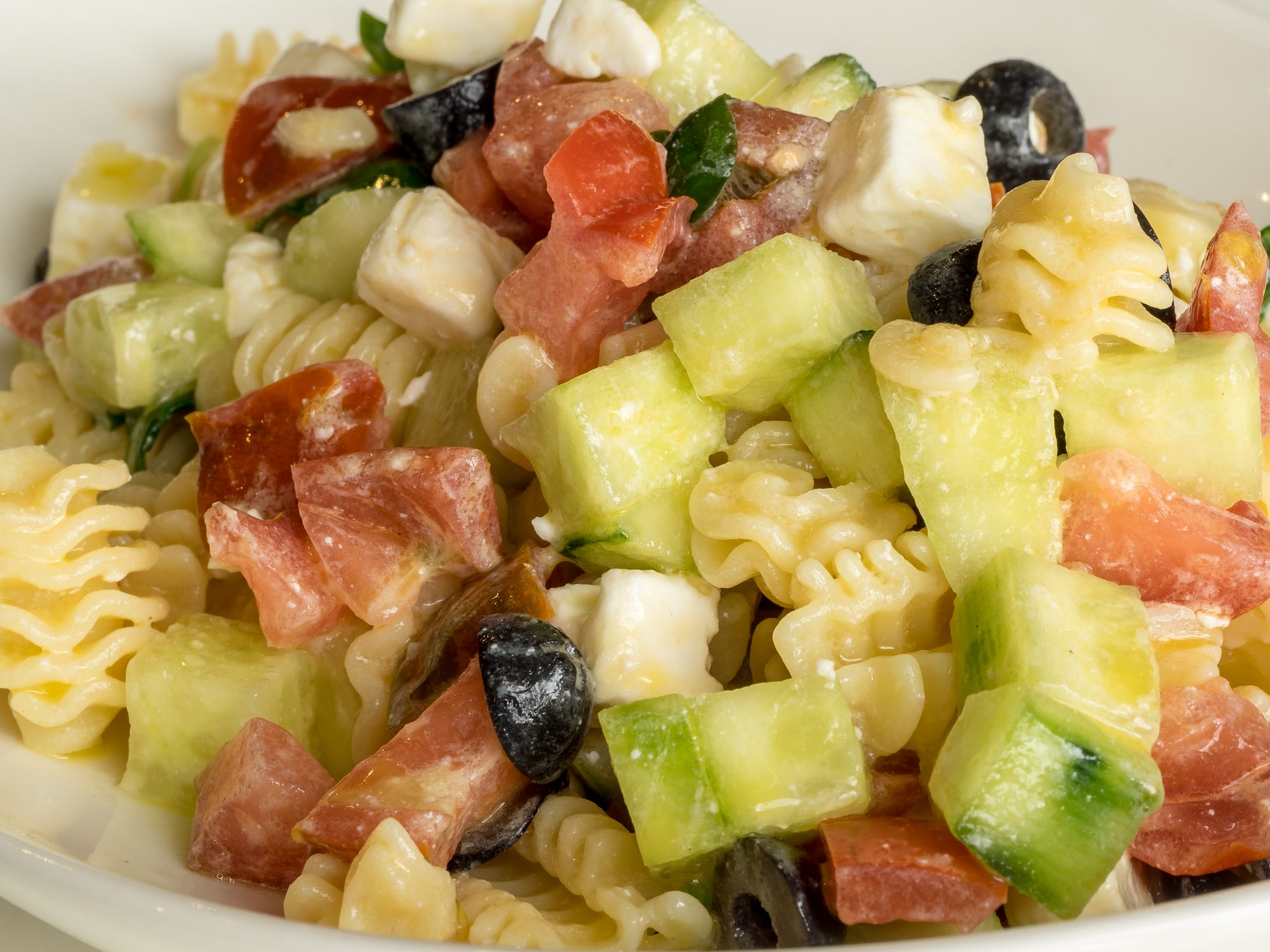 Pasta fusilli, pepino, tomate, queso feta, aceituna negra y hierbabuena, aliñada con vinagreta de lima