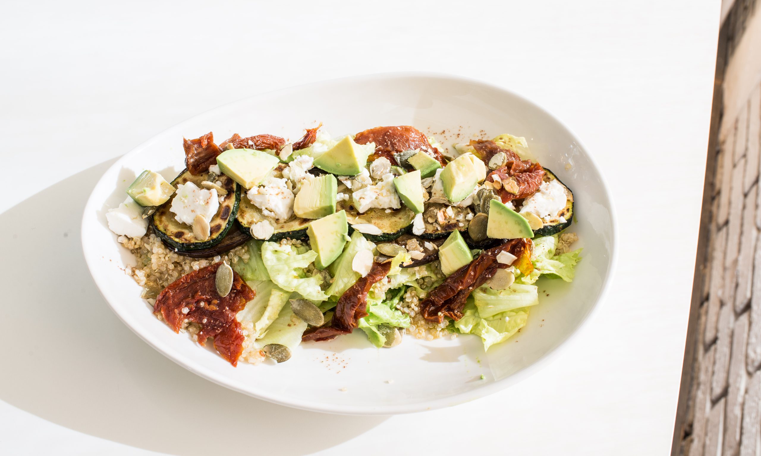 Alta en proteínas, baja en carbohidratos. Berenjena, calabacín, tomate seco, pipa de calabaza, quinoa, lechuga, cebolleta, aguacate, queso fresco, aliñada con vinagreta de mostaza