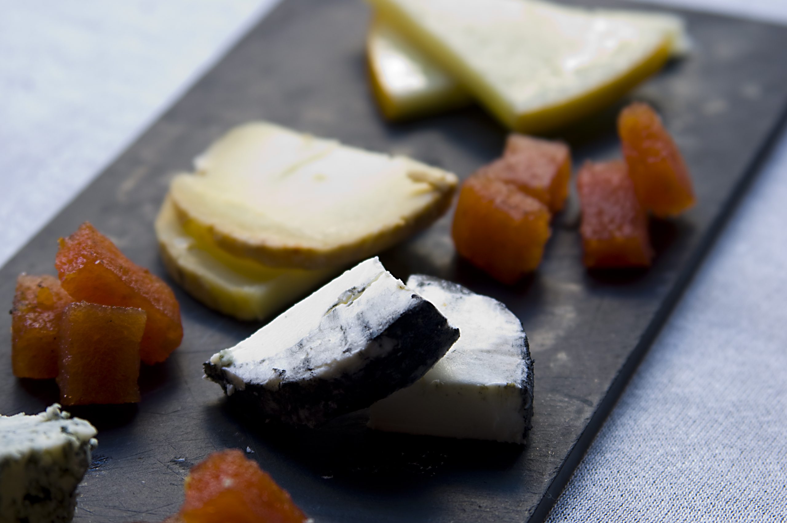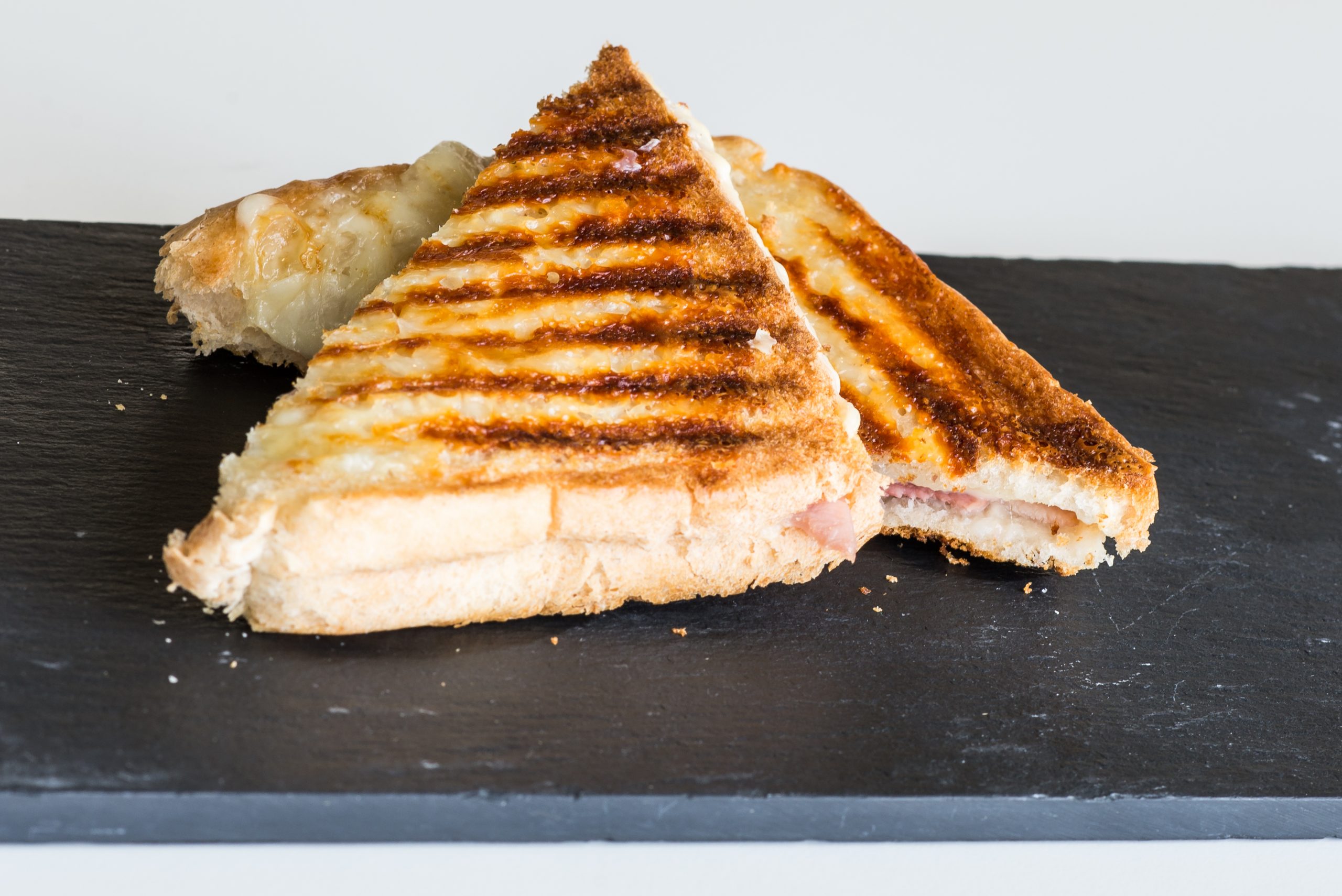 Chedar, cabra, pata de mulo y parmesano. Tomate natural, pepino agridulce con pan blanco de masa madre