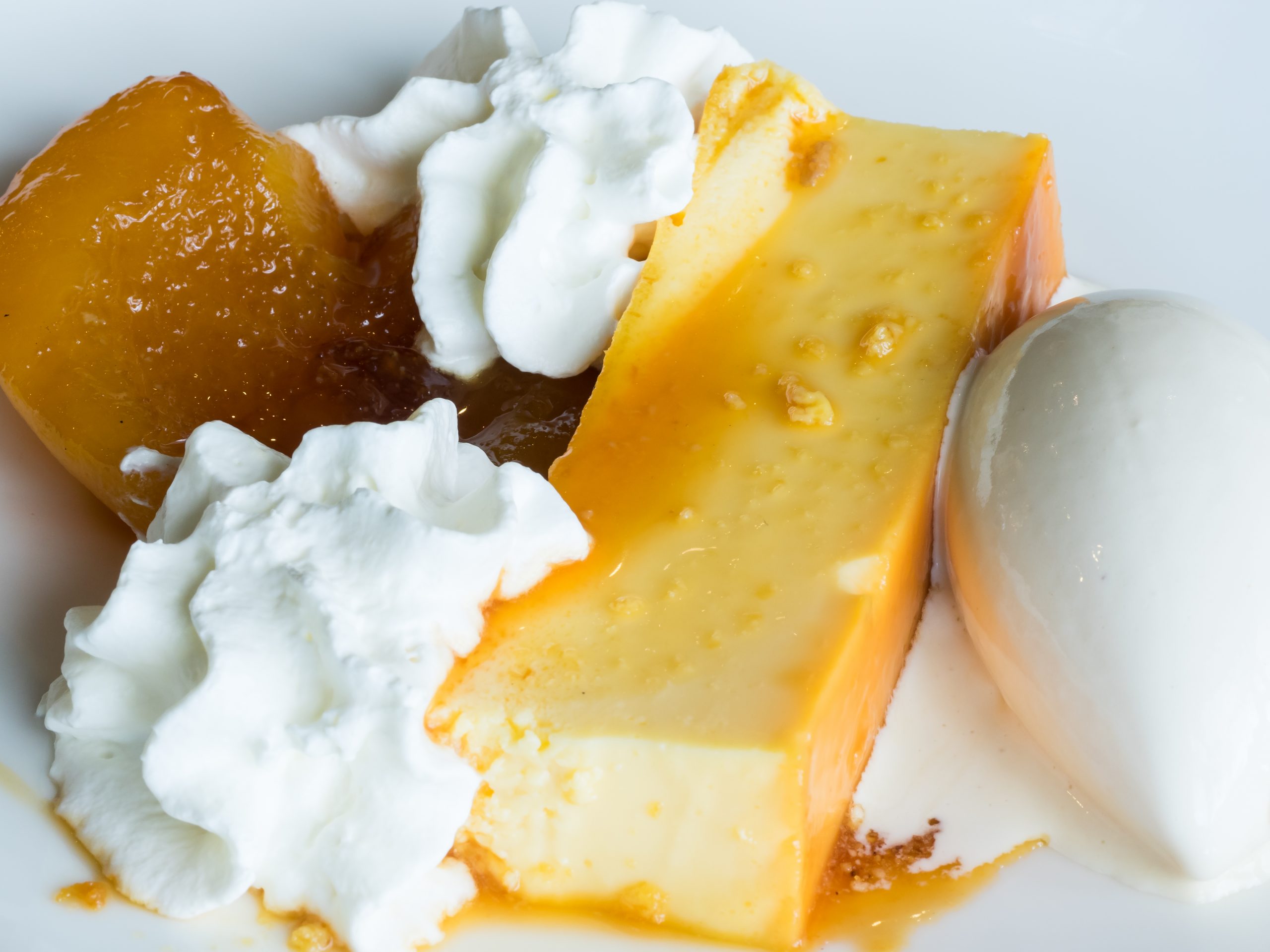"... vuelve el mito revisado". Flan casero, nata de la buena, helado de vainilla de Madagascar y melocotón horneado