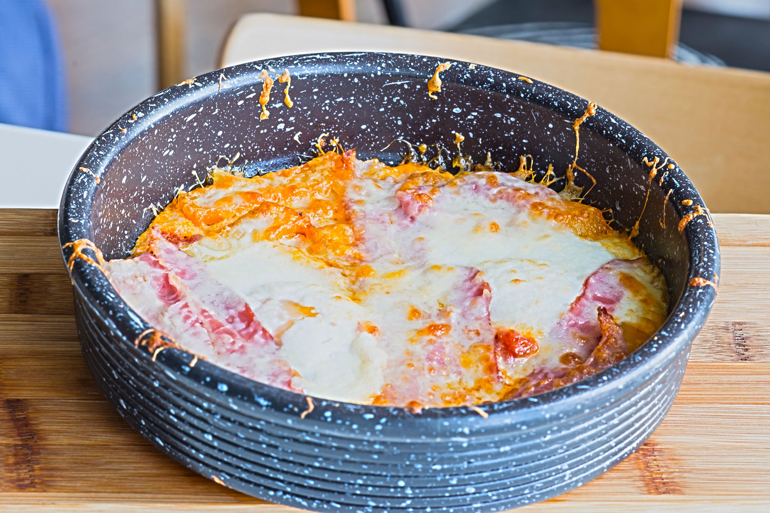 Salsa de tomate casera, patatas, bacon ahumado y queso gratinado, ... "la bomba"